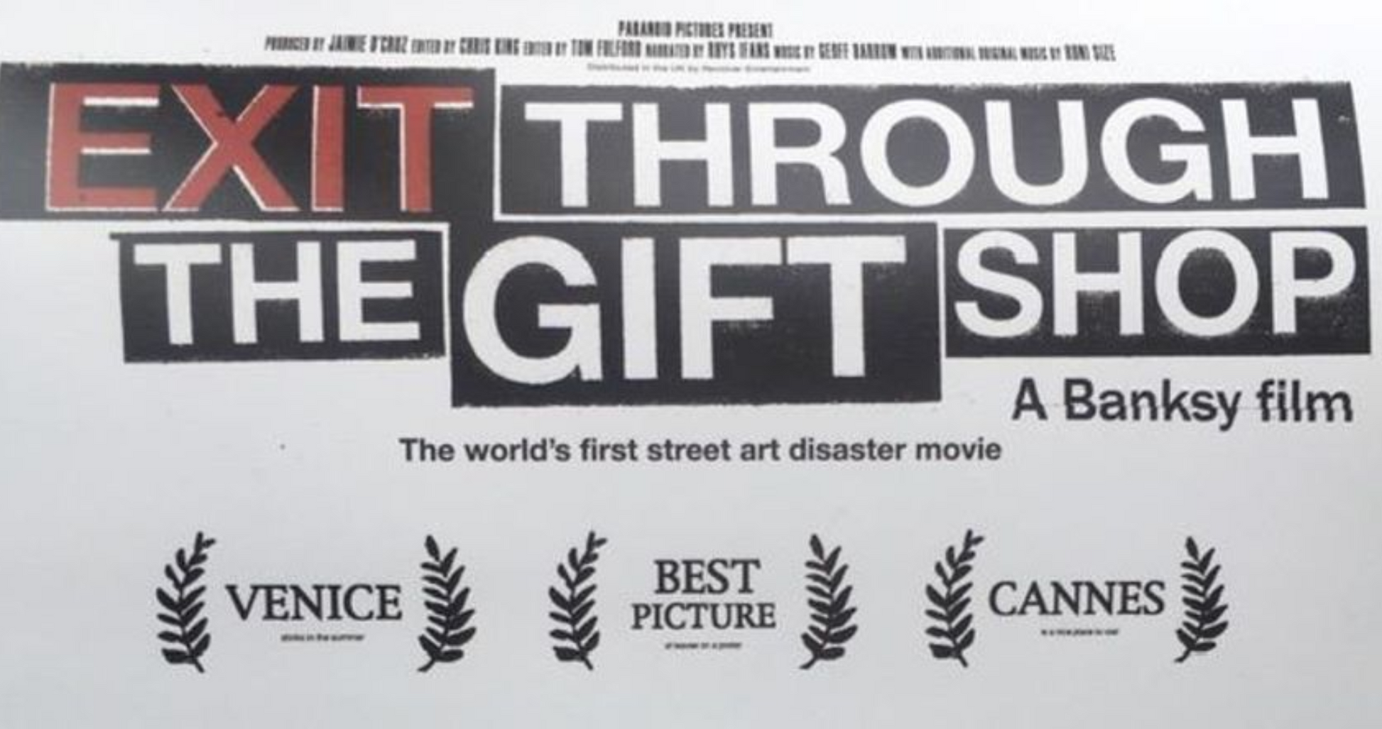Exit Through The Gift Shop is a mockumentary "edited" by Banksy, in which a film-maker hanging out with key street artists decides to cash in on the art world's credulity himself – (The Telegraph, 6 March 2010).