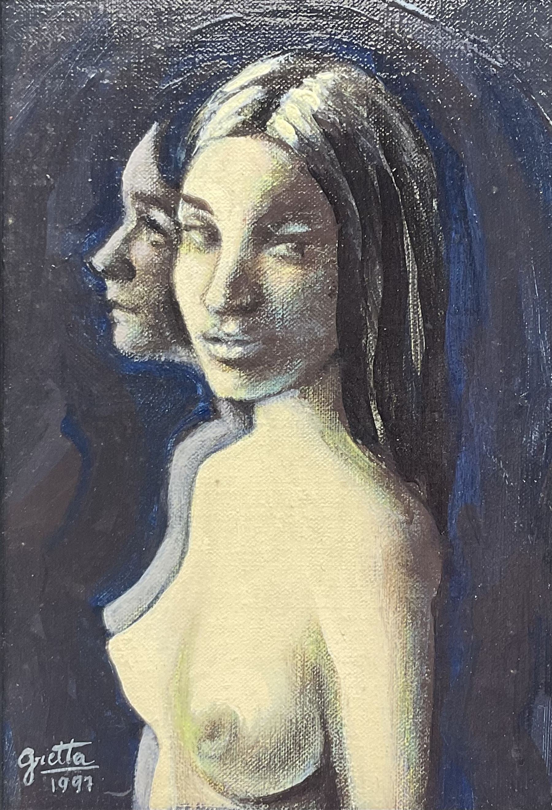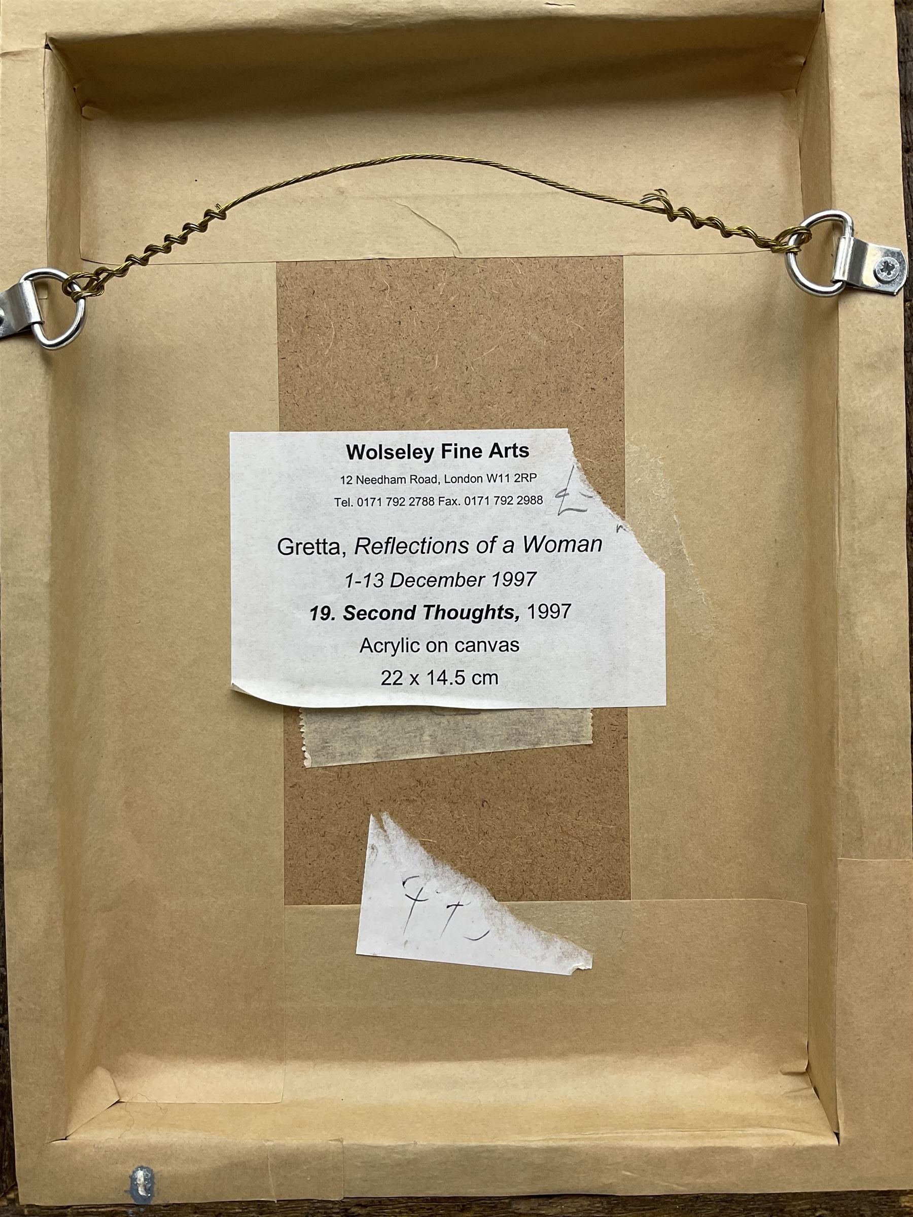 This painting is part of a series produced by Gretta in 1997 and exhibited at Wolseley Fine Arts in London, it is dedicated to female identity, body and expression.