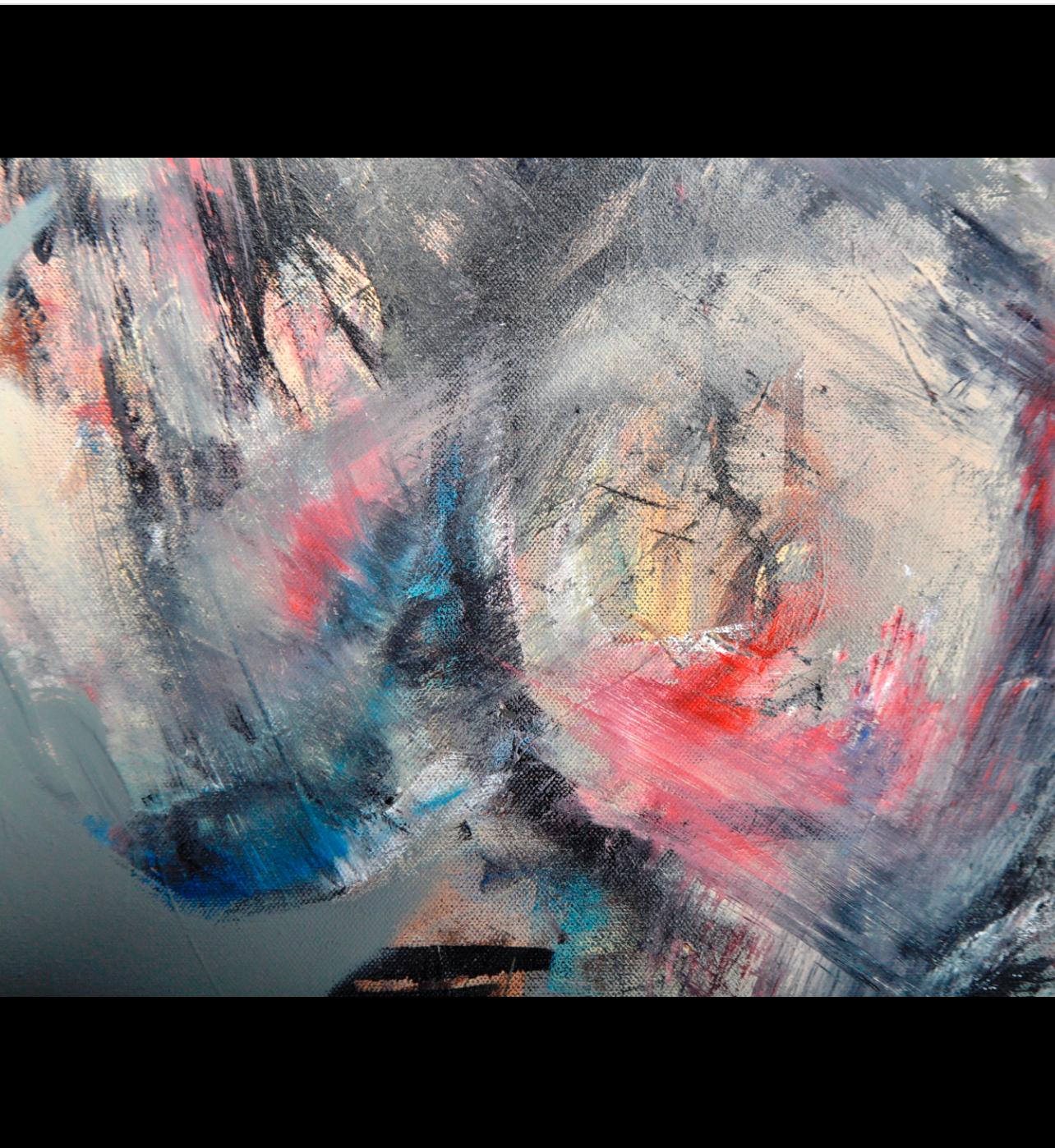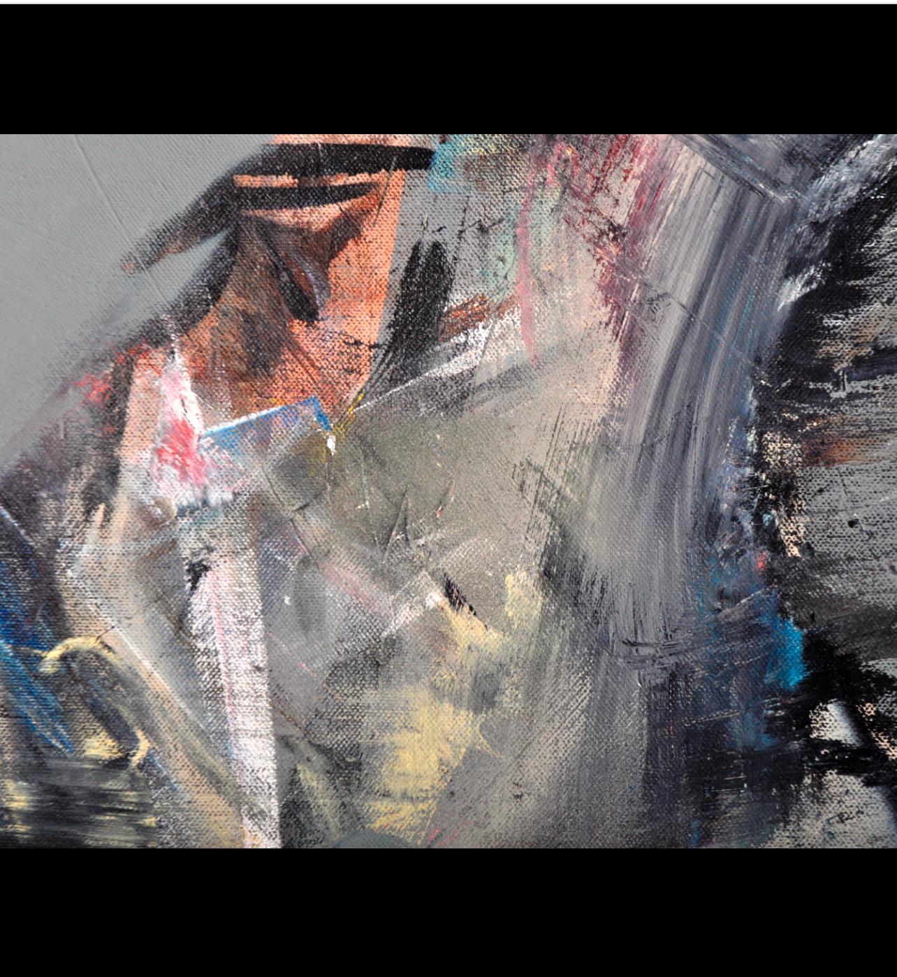 A contemporary oil on canvas expressionists' / abstract painting depicting a stylized female figure with uses of mixed colours creating a distorted finish. All painted on a grey background with black borders.