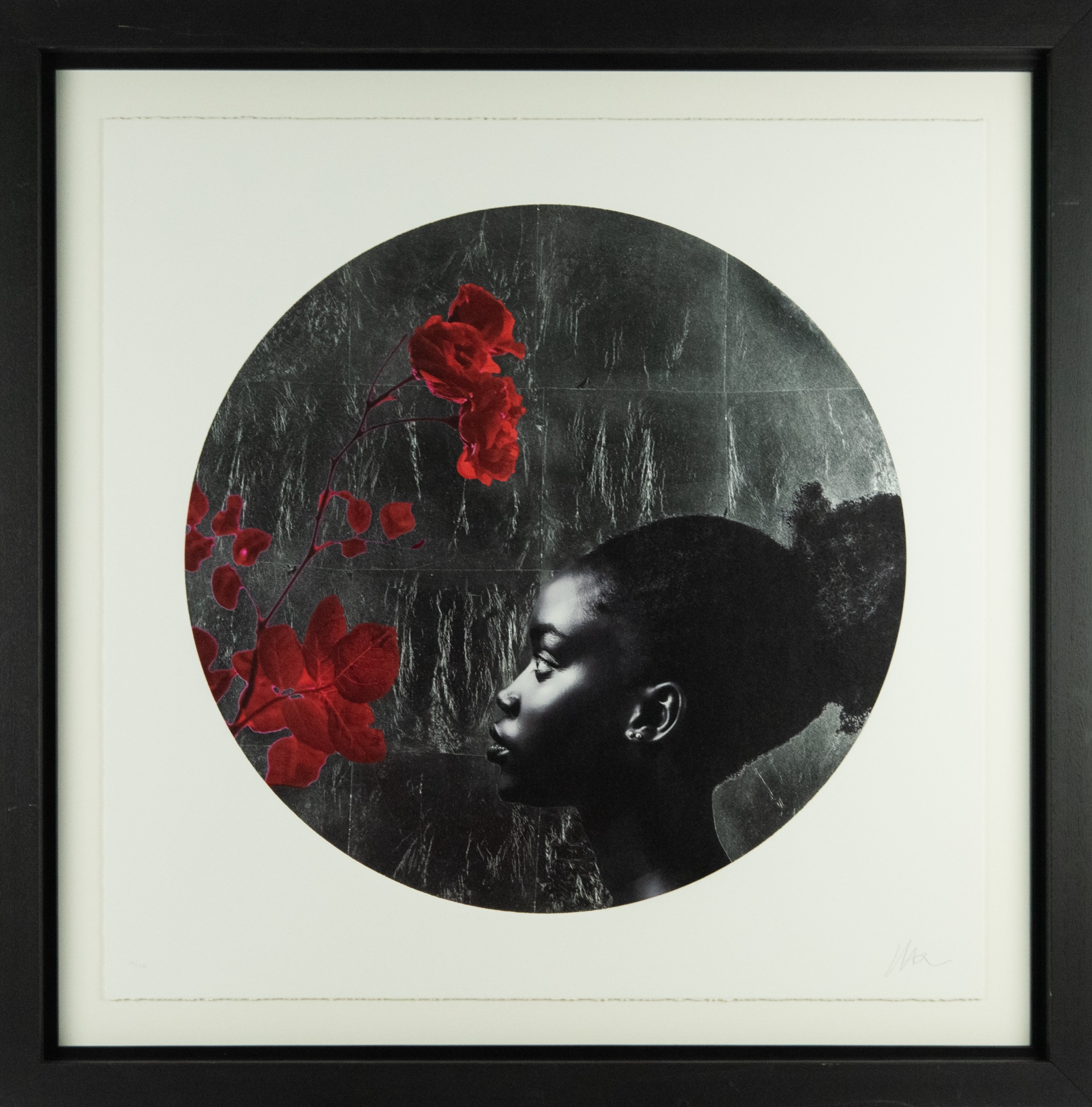 Artist signed limited edition circular colour print behind glass