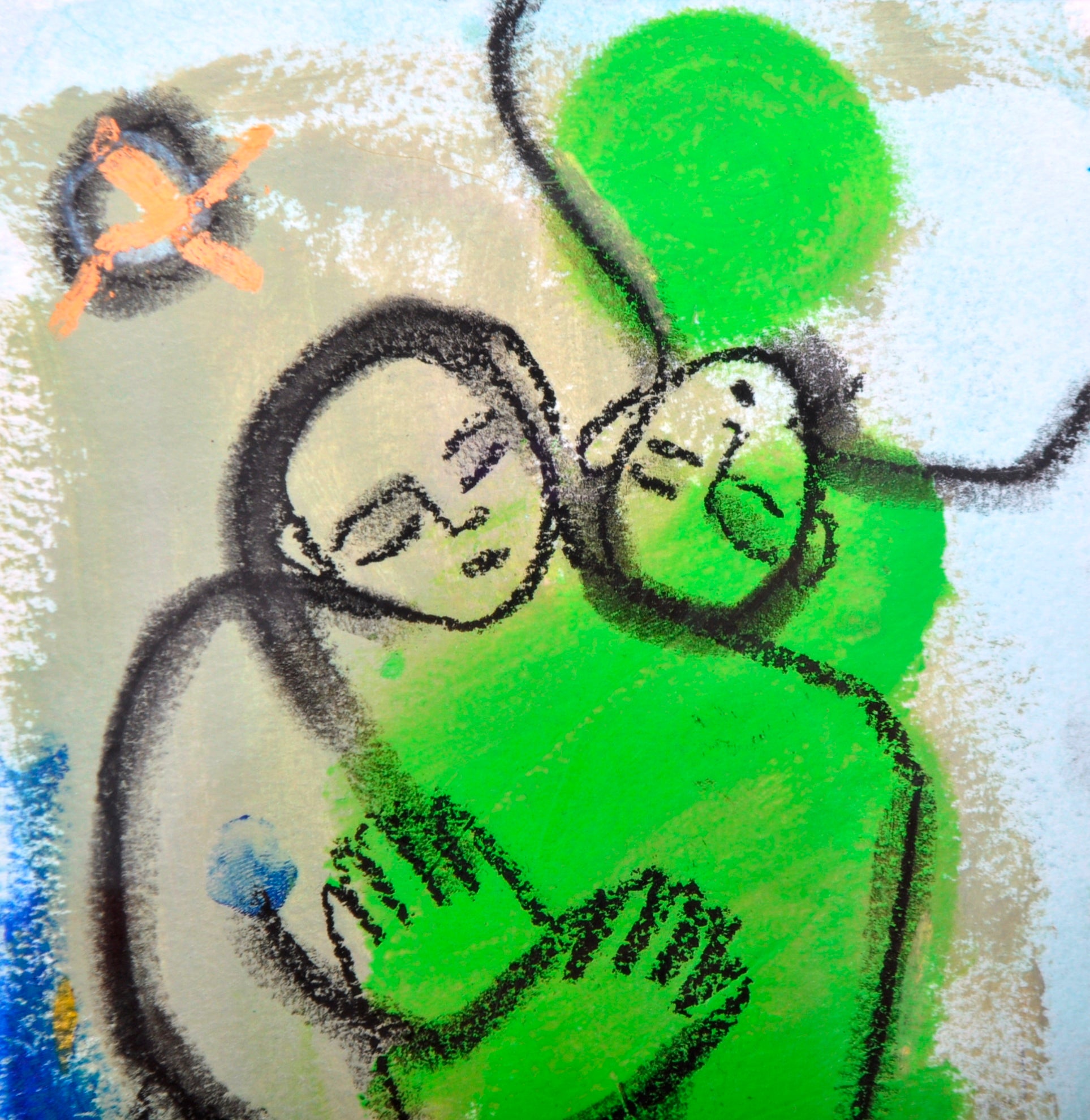 A late 20th Century abstract charcoal and acrylic mixed media painting depicting two stylized sleeping figures with green and blue tones